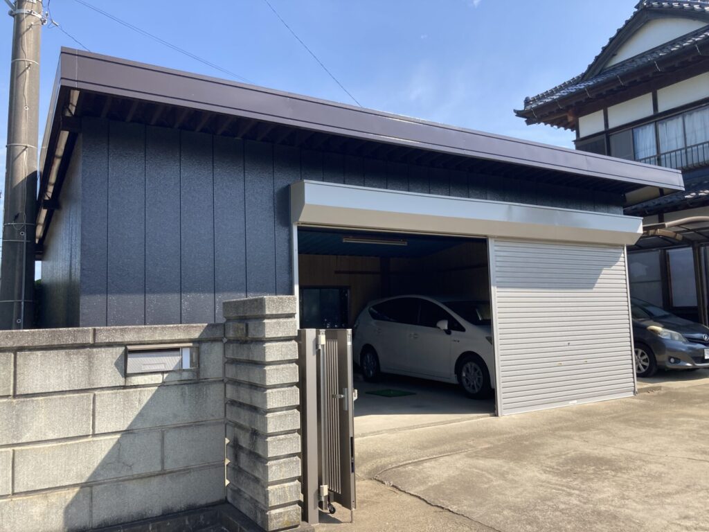 敷地内の倉庫は、お家との統一感を持たせるために外壁と同じ色で塗装することにしました。