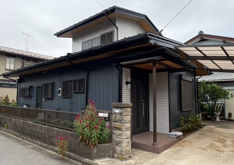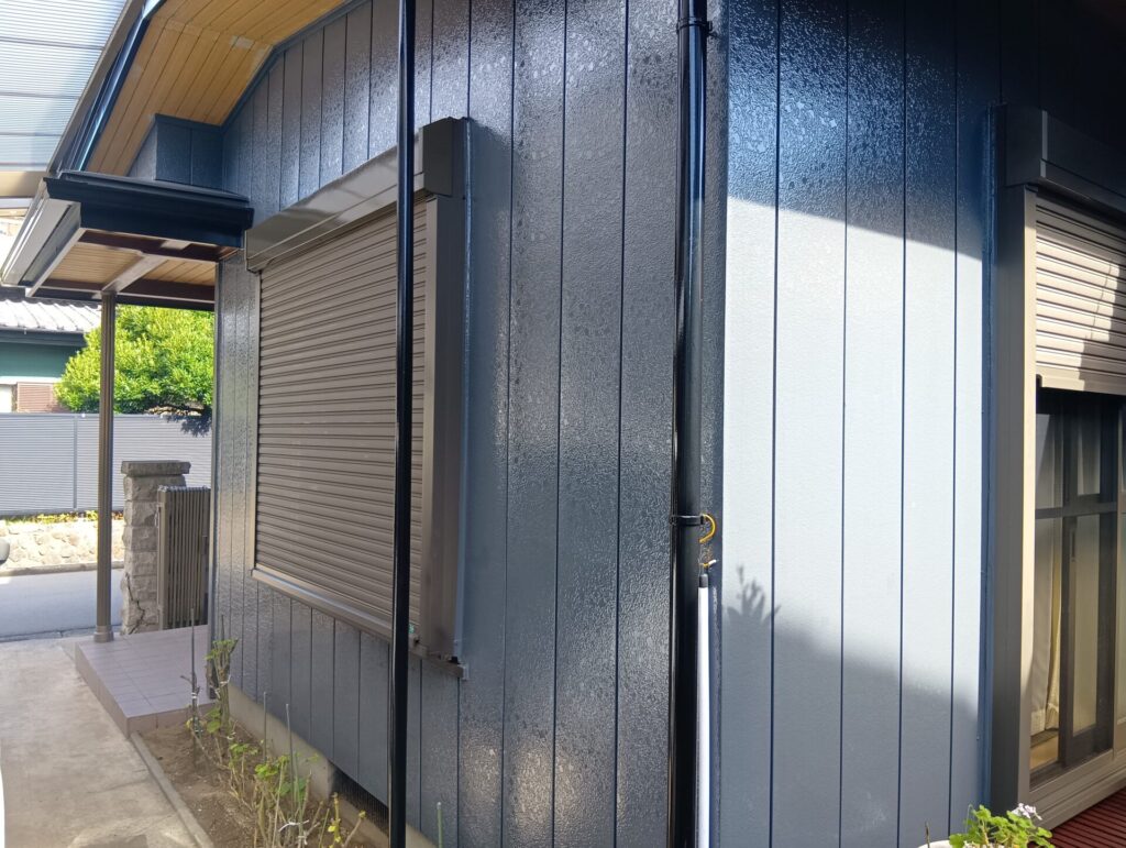 破風板・雨樋はブラック、庇やシャッターBOXなどは外壁と相性の良い色で塗装し、統一感を重視しました。